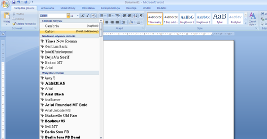 Czas wreszcie wykorzystać wybrane funkcje Worda. Należy otworzyć „zakładkę narzędzia główne”. Na początek weźmy na spróbowanie zmianę czcionki. Czcionką nazywamy sposób zapisu liter, który w zależności od jej rodzaju oferuje odmienne kształty, litery z ozdobnikami. Czcionka jest pewnego rodzaju stylem pisania. Word oferuje duży wybór czcionek. Można je podzielić na czcionki szeryfowe i bezszeryfowe. Czcionki bezszeryfowe różnią się od szeryfowych tym, że nie zawierają ozdobników liter- ich końcówki są proste. Do czcionek bezszeryfowych zaliczamy popularny Arial, Verdana lub Calibri. Najpopularniejszą czcionką szeryfową jest Times New Roman i jego różne warianty.