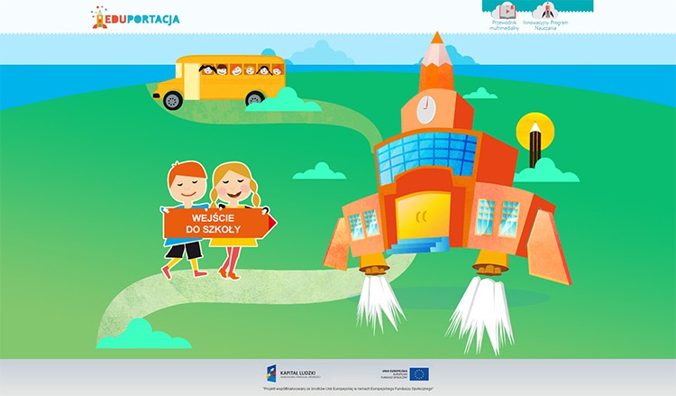Ekran startowy jest zaproszeniem do korzystania z platformy edukacyjnej jaką jest nowoczesnaszkola.com.pl. Po kliknięciu na napis , który trzymają dzieci „wejście do szkoły” rozpoczyna się animacja startu rakiety i użytkownik automatycznie przenoszony do ekranu logowania.