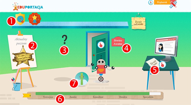 (2) Aktualny poziom doświadczenia ucznia. Na sztaludze wyświetla się graficzna ikona poziomu doświadczenia, jednak jest ona powiązana z listwą postępową na dole ekranu (6).