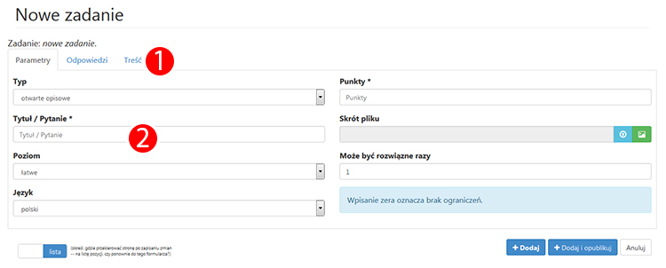 - Może być rozwiązane razy: - podajemy ile razy użytkownik może rozwiązać zadanie, wpisanie "0" oznacza brak ograniczeń.
