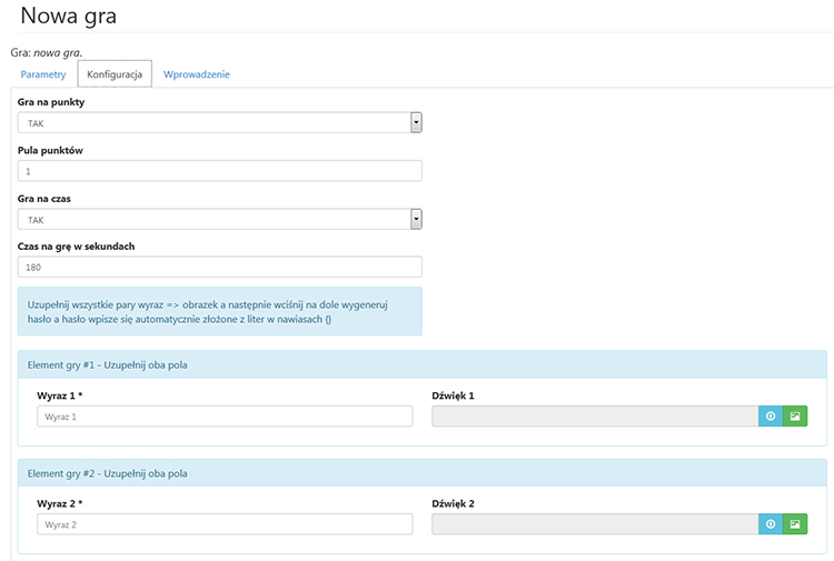 - czas na grę w sekundach – limit czasu na rozwiązanie gry, działający jeśli powyższy znacznik będzie ustawiony na TAK